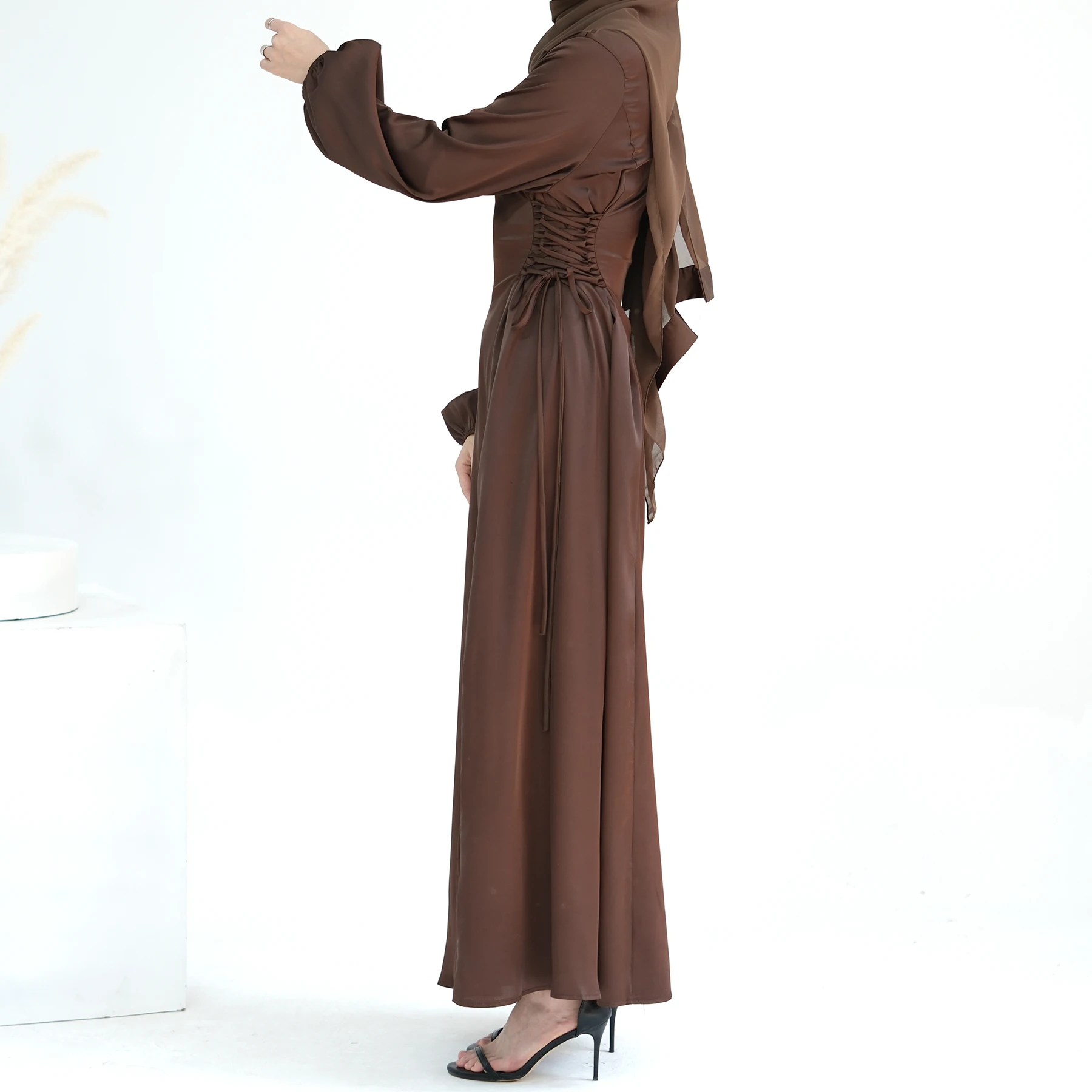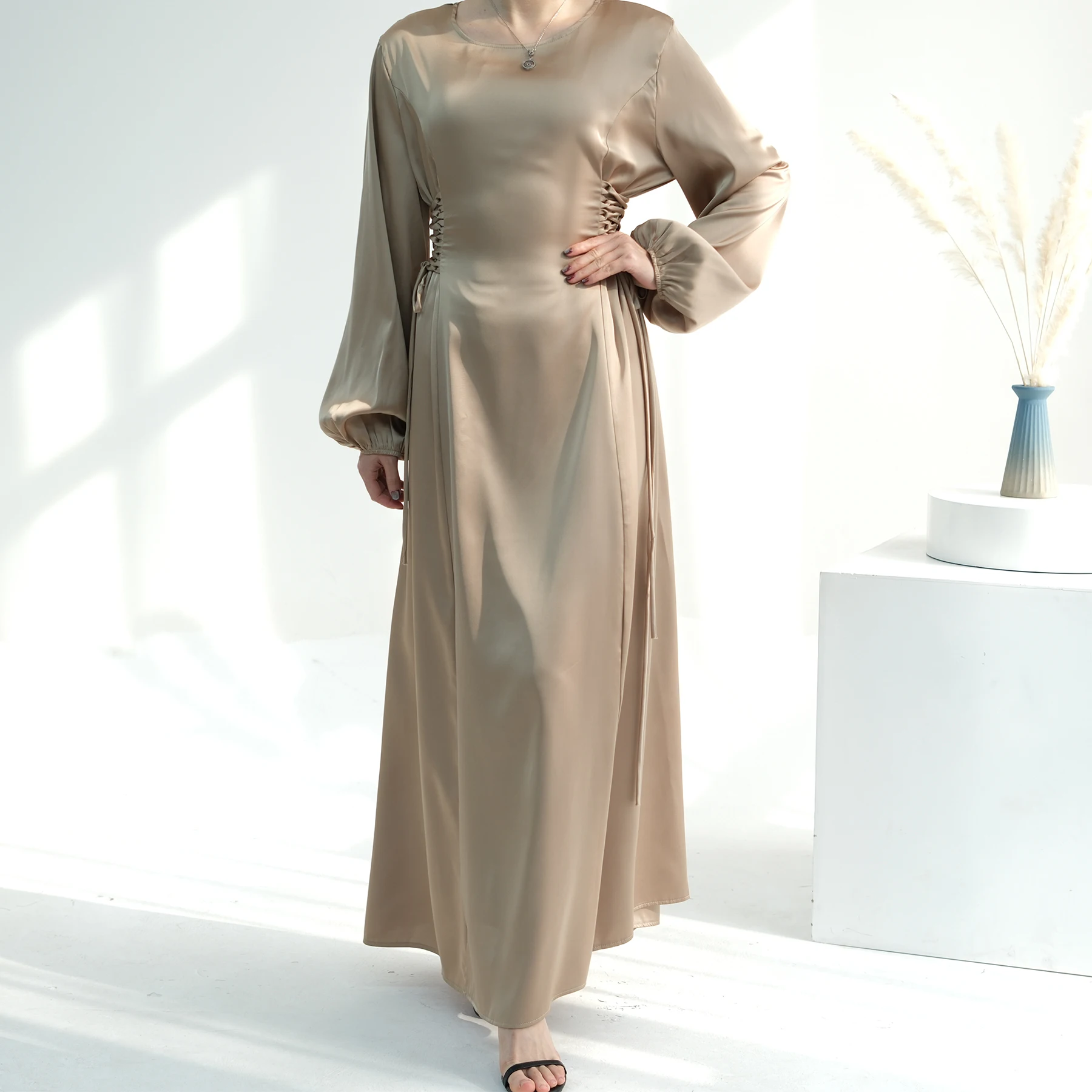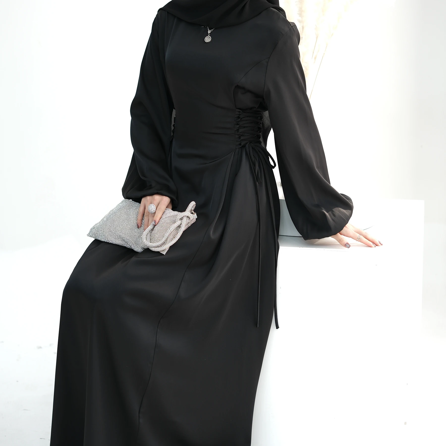 Elegant Dubai Turkish Abayas For Women 2024 Muslim Dress Slim Waist With Bandage Caftan Solid Pink Black Blue Green LR702